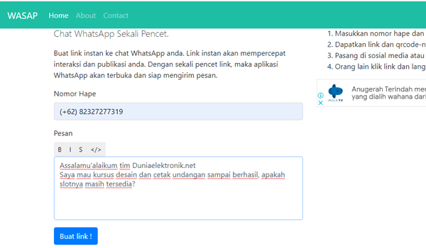 Bagi kamu yang bingung hendak membuat blog, web atau toko online tak perlu bingung. Selain melayani jasa pembuatan, duniaelektronik.net juga membuka kursus gratis sampai kamu berhasil.